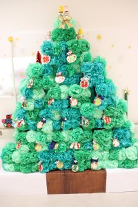 薬局のスタッフが作成してくれた1から24の日付の飾りにビニールタイを通してボックスに取り付けたり、お花紙のお花を飾っていきます。