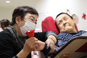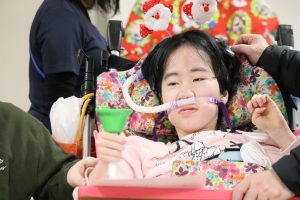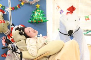 一番盛り上がった最後のプログラムは、サンタクロースと可愛いトナカイさんからのプレゼントと写真撮影です。今年は、メンバーさんを担当する看護師、支援員、リハビリスタッフが話あい、もらったら使ってくれるだろうなというプレゼントを1人1人に合わせて用意しました。プレゼントの種類が多かったので、最初に行ったお店でそのメンバーさんに合うものが無かったらお店をはしごして選んだプレゼント、すごく喜んでくれました。